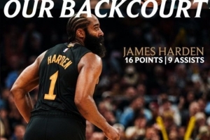 赛后骑士官推发布后场双枪数据海报,米切尔本场比赛拿到17分7助攻,哈登16分9助攻。