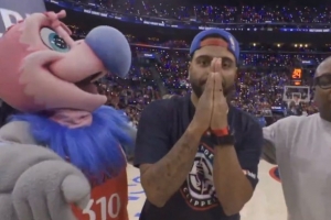 比赛间歇时快船主场举行球迷互动活动,一名身穿快船球衣的球迷中圈投篮命中,赢得1万美元!