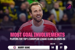 体育资讯3月3日讯 Opta统计了五大联赛球员本赛季的参与进球数量,并列出榜单,凯恩参与50球居首,姆巴佩参与43球次席。