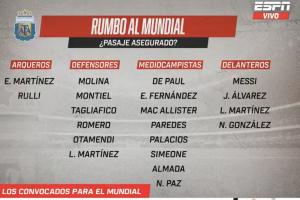 体育资讯03月26日讯 据ESPN阿根廷版报道,阿根廷世界杯名单中已有20名球员锁定席位,剩余的6个名额将由16名球员争夺。