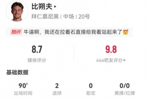 体育资讯4月4日讯 拜仁在本轮德甲3-2逆转弗赖堡,比朔夫本场数据如下:
