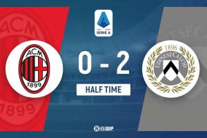 上半场比赛结束,AC米兰0-2乌迪内斯。