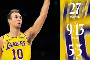 本场比赛肯纳德13中9,三分5中5,罚球6中4砍下27分4篮板3助攻。