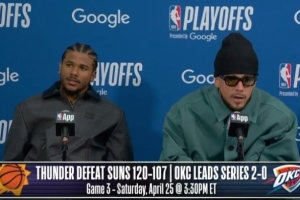 体育资讯4月23日讯 NBA季后赛,太阳107-120不敌雷霆,大比分0-2落后,赛后杰伦·格林和布克接受了媒体采访,以下为采访全文。