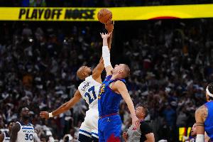 戈贝尔本场比赛几乎跟约基奇同上同下,继续锁死约基奇,将其防出26投7中的季后赛生涯最低命中率,并且对掘金其他球员也产生了极强的防守威慑力,用防守彻底改变了比赛局势。