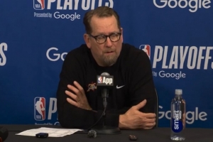 纳斯:是的,我们对位做得不够好,而且,很多问题源我们没能让合适的人去防守,很多问题源于我们自己不得分,然后他们打转换进攻,有时候转换中对位就乱了,我们就是无法挡在他前面,我们显然在协防时过度放空了他,让他接到了分球后的一传投篮,如果他没投,我们对他的补防又慢了。我们就是防守移动不好,决策也不好,而且我们根本没有一对一防住他。