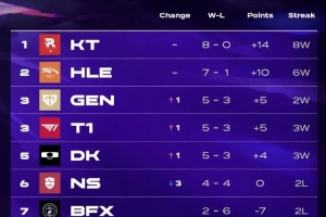 KT 8-0位居第一,HLE 7-1位居第二,GEN、T1、DK三队同为5-3。