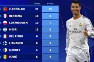 欧冠改制后半决赛进球榜:C罗13球居首,本泽马、莱万、梅西在列