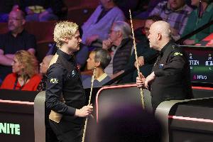 1/8决赛,希金斯在两阶段结束后,7-9落后奥沙利文,第三阶段比赛,希金斯13-12逆转奥沙利文,晋级八强。